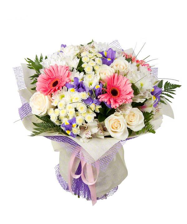 Воздушный букет, собранный из роз, крупных гербер, ирисов и хризантем – это воплощение искренних пожеланий и самых нежных чувств. Такой цветочный микс наделен позитивной аурой и способен подарить близкому человеку радость и прекрасное настроение. Каждый их цветков в букете имеет свою символику, но сочетаясь, они обретают особую ценность, так как вместе выглядят более оригинально и привлекают к себе внимание.
